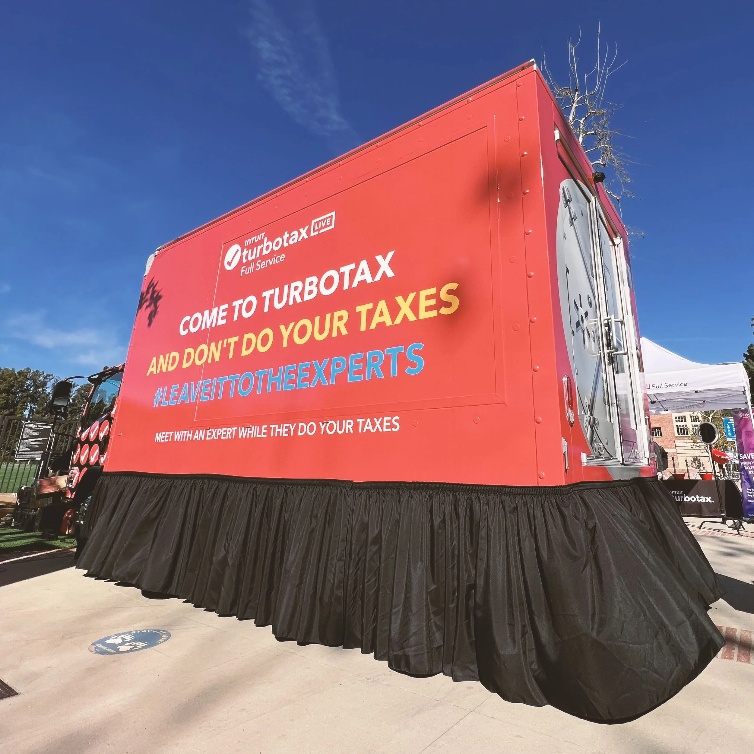 TurboTax brought an interactive game show experience to campus, inviting students to step inside a custom-designed truck and test their tax knowledge. I designed both the interior and exterior of the truck, including the on-screen game interface. Additionally, I created the surrounding event materials such as banners and tent graphics, ensuring a cohesive and visually impactful experience from start to finish.